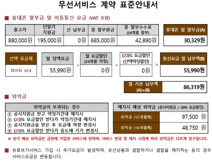 (서울=포커스뉴스) 앞으로 통신서비스 이용조건에 대한 안내가 강화된다. 방송통신위원회는 휴대폰 월 할부금, 통신요금 월 납부액, 월 기본 납부액, 위약금 등 통신서비스 이용에 관한 중요한 사항이 포함된 유·무선 통신서비스 계약 표준안내서를 7월말 도입한다.