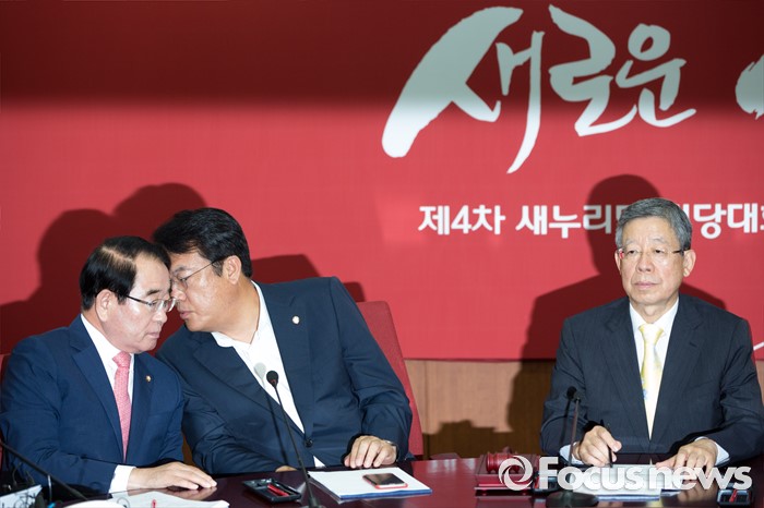(서울=포커스뉴스) 정진석(가운데) 새누리당 원내대표와 박명재(왼쪽) 사무총장이 25일 오전 서울 여의도 새누리당사에서 열린 혁신비상대책위원회의에 참석해 대화 하고 있다.