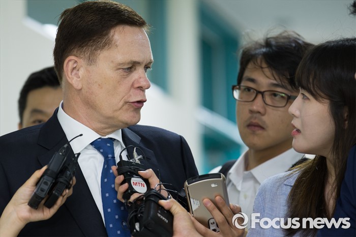 (인천=포커스뉴스) 요하네스 타머(가운데) 아우디폭스바겐 사장이 25일 오전 인천 서구 국립환경과학원에서 열린 차량 인증 조작 관련 환경부 청문회에 참석하고 있다.