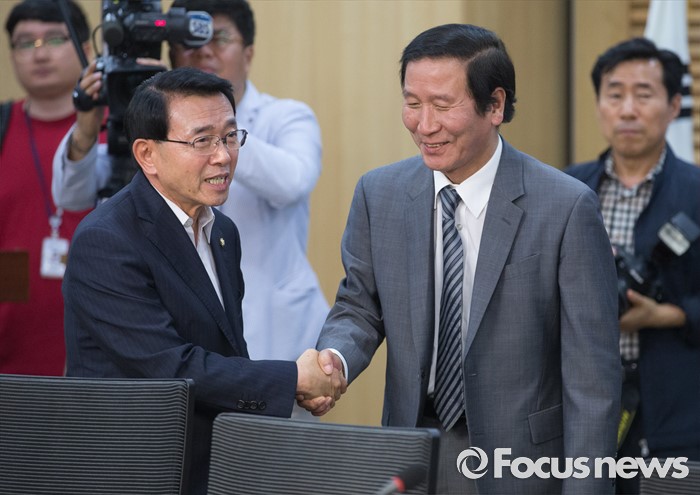 (서울=포커스뉴스) 25일 오전 서울 여의도 국회 의원회관에서 개성공단살리기 국회의원 모임 주최로 열린 개성공단 전면중단, 고도의 정치적 행위 논리 정당한가? 세미나에 참석한 정기섭(오른쪽) 개성공단기업 비대위원장과 심재권 국회 외교통일위원장이 악수하고 있다.