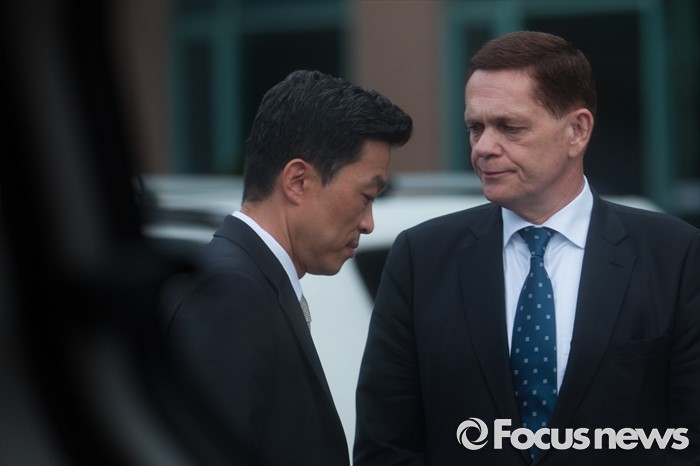 (인천=포커스뉴스) 요하네스 타머(오른쪽) 아우디폭스바겐 사장과 정재균 부사장이 25일 오전 인천 서구 국립환경과학원에서 열린 차량 인증 조작 관련 환경부 청문회를 마친 후 청문회장을 나서며 굳은 표정을 짓고 있다.