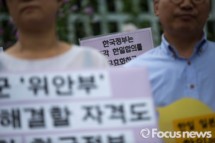 (서울=포커스뉴스) 25일 오전 서울 종로구 정부서울청사 앞에서 화해·치유재단 설립 강행하는 정부를 규탄하는 정대협(한국정신대문제대책협의회) 및 일본군 위안부 피해자 할머니들의 집회가 열리고 있다.