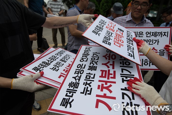 (서울=포커스뉴스) 25일 오전 서울 중구 롯데백화점 앞에서 롯데홈쇼핑 협력사 비상대책위원회원들이 생존권 보장을 촉구하며 집회를 열고 있다.