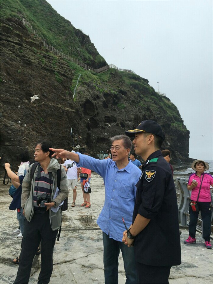 (서울=포커스뉴스) 문재인 더불어민주당 전 대표가 광복절을 앞두고 25일 독도를 방문, 송지원 경비대장에게 설명을 들으며 둘러보고 있다. <사진제공=문재인 전 대표측>