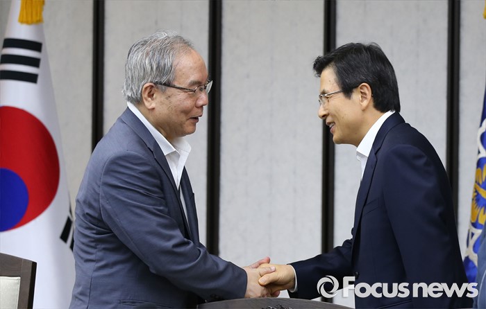 (세종=포커스뉴스) 황교안 국무총리가 25일 오후 세종시 정부세종청사 국무총리실에서 열린 원자력진흥위원회에서 참석자와 악수를 하고 있다.