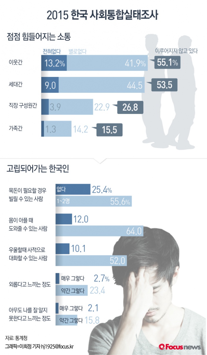 (서울=포커스뉴스) 통계청의 '사회통합실태조사-사회적 소통 부분(2015)' 의하면 한국은 사회구성원 간의 의사소통이 줄어들고 대인관계가 사라져 가고 있다.