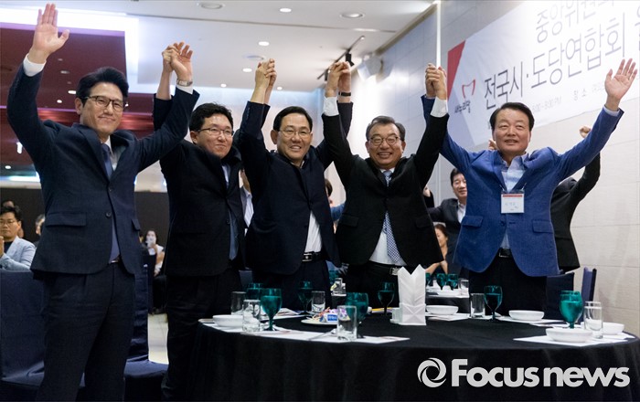 (서울=포커스뉴스) 전당대회 대표최고위원 출마를 선언한 정병국(왼쪽부터), 김용태, 주호영, 이정현, 한선교 새누리당 의원이 25일 오후 서울 여의도 중소기업중앙회관에서 열린 중앙위원회 전국시도당연합회 월례회 행사에 참석해 취재진을 향해 포즈를 취하고 있다.