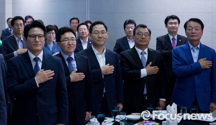 (서울=포커스뉴스) 전당대회 대표최고위원 출마를 선언한 정병국(왼쪽부터), 김용태, 주호영, 이정현, 한선교 새누리당 의원이 25일 오후 서울 여의도 중소기업중앙회관에서 열린 중앙위원회 전국시도당연합회 월례회 행사에 참석해 국기에 대한 경례를 하고 있다.