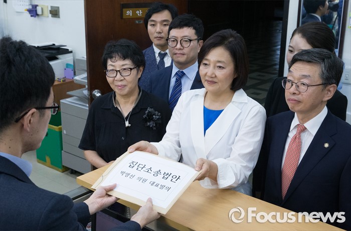 (서울=포커스뉴스) 박영선 더불어민주당 의원과 관계자들이 26일 오전 서울 여의도 국회 의안과에서 집단소송법 제정 법안을 제출하고 있다. 박 의원은 앞서 기자회견을 통해 "미국에만 거액 배상을 합의한 폭스바겐측의 행태는 현행 민사소송법 한계를 드러낸 것으로 우리 국민들의 적절한 피해배상과 신속한 권리구제를 위해 징벌적 배상제 도입과 함께 집단소송제 도입이 시급해 대표발의했다"고 전했다.