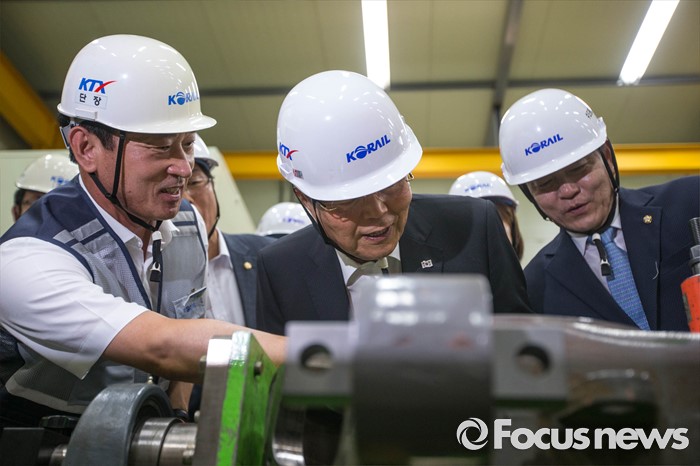 (고양=포커스뉴스) 김종인 더불어민주당 비대위 대표가 26일 오전 경기도 고양시에 위치한 수도권철도차량정비단을 방문, 관계자에게 설명을 듣고 있다.