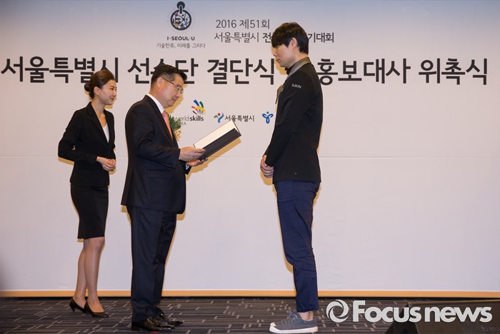 (서울=포커스뉴스) 26일 오전 서울 종로구 세종문화회관에서 열린 '2016 전국기능경기대회 서울특별시 선수단 결단식 및 홍보대사 위촉식'에 참석한 류경기(왼쪽 두번째) 서울시 행정1부시장이 요리사 최현석에게 홍보대사 위촉장을 전달하고 있다.