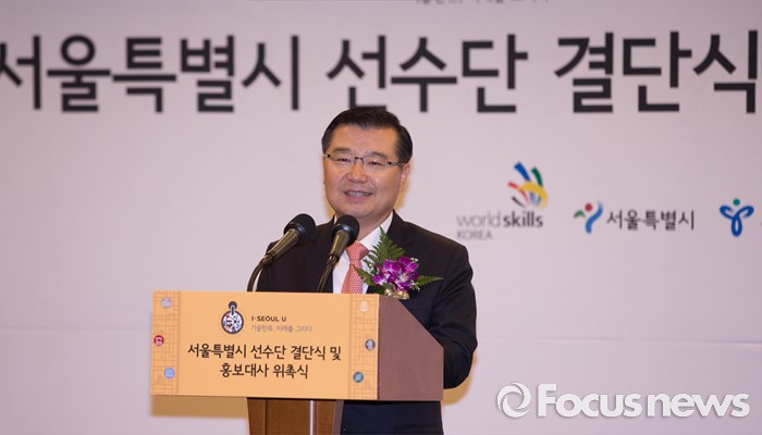 (서울=포커스뉴스) 26일 오전 서울 종로구 세종문화회관에서 열린 '2016 전국기능경기대회 서울특별시 선수단 결단식 및 홍보대사 위촉식'에 참석한 류경기 서울시 행정1부시장이 인사말을 하고 있다.