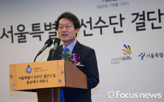 (서울=포커스뉴스) 26일 오전 서울 종로구 세종문화회관에서 열린 '2016 전국기능경기대회 서울특별시 선수단 결단식 및 홍보대사 위촉식'에 참석한 조희연 서울시 교육감이 축사를 하고 있다.