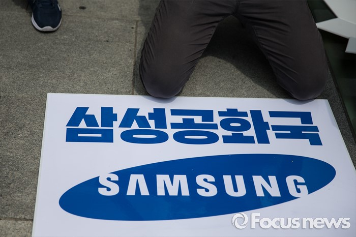 (서울=포커스뉴스) 26일 오전 서울 종로구 광화문광장에서 열린 삼성 경영권 세습 공개토론 제안 기자회견에 참석자들이 삼성의 경영세습을 비판하는 퍼포먼스를 하고 있다.