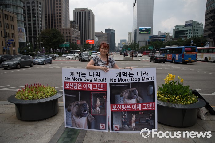 (서울=포커스뉴스) 26일 오전 서울 종로구 광화문광장에서 세이브 코리언 독스 회원이 개고기 문화를 반대하는 피켓을 들고 있다.