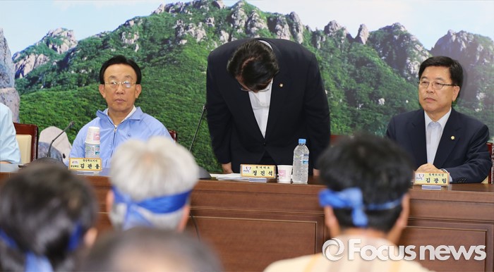 (성주=포커스뉴스) 26일 오전 경북 성주군청을 찾은 정신석 새누리당 원내대표와 지도부들이 성주군민들과 간담회를 앞두고 허리숙여 사죄하고 있다.