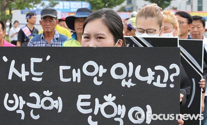 (성주=포커스뉴스) 26일 오전 경북 성주군청에서 정신석 새누리당 원내대표와 지도부들이 성주군민들과 간담회를 앞두고 주민들이 사드배치 반대를 외치고 있다.