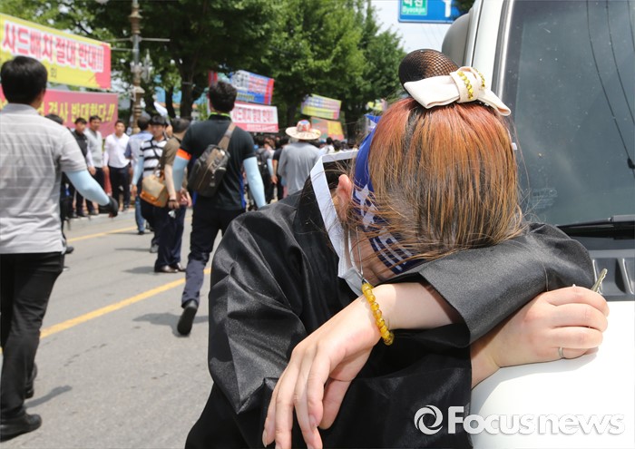 (성주=포커스뉴스) 정신석 새누리당 원내대표와 지도부들이 26일 오전 경북 성주군청에서 성주군민들과 간담회를 마치고 떠난뒤, 여성 주민이 오열하고 있다.