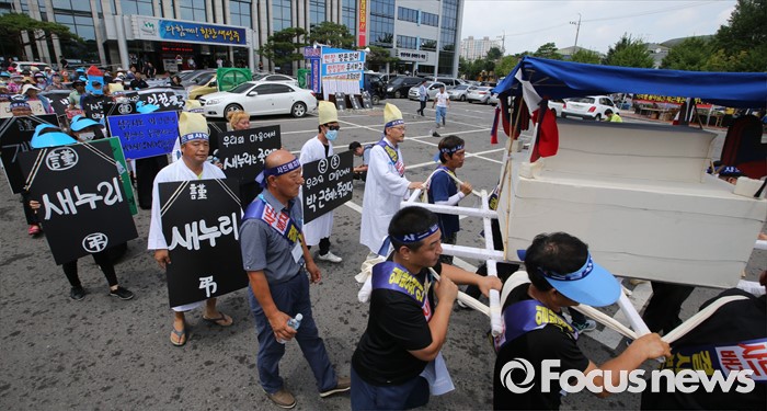 (성주=포커스뉴스) 26일 오전 경북 성주군청을 찾은 정신석 새누리당 원내대표와 지도부들이 성주군민들과 간담회를 가진 가운데 성주주민들이 상여를 매고 사드배치 반대를 촉구하고 있다.