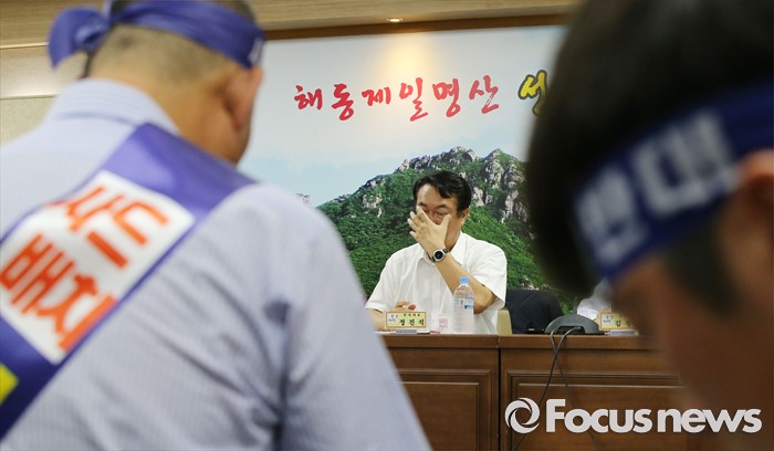 (성주=포커스뉴스) 26일 오전 경북 성주군청을 찾은 정신석 새누리당 원내대표와 지도부들이 성주군민들과 간담회를 갖고 있다.