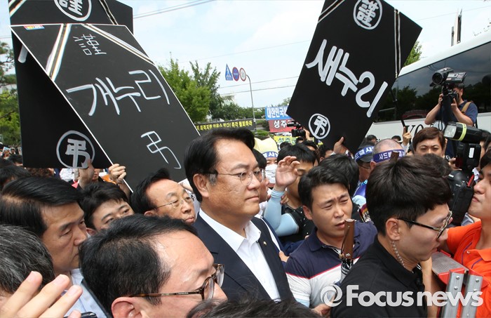 (성주=포커스뉴스) 26일 오전 경북 성주군청을 찾은 정신석 새누리당 원내대표와 지도부들이 성주군민들과 간담회를 마치고 군청을 나와 버스로 이동중 주민들에게 항의를 받고 있다.