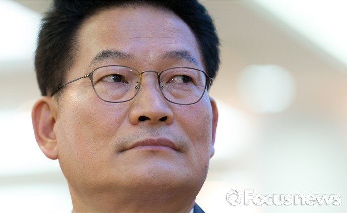 (서울=포커스뉴스) 26일 오후 서울 서초구 엘루체에서 열린 더불어민주당 서울특별시당 서초갑 정기지역대의원대회에서 전당대회 출마를 선언한 송영길 의원이 대회 시작을 기다리고 있다.