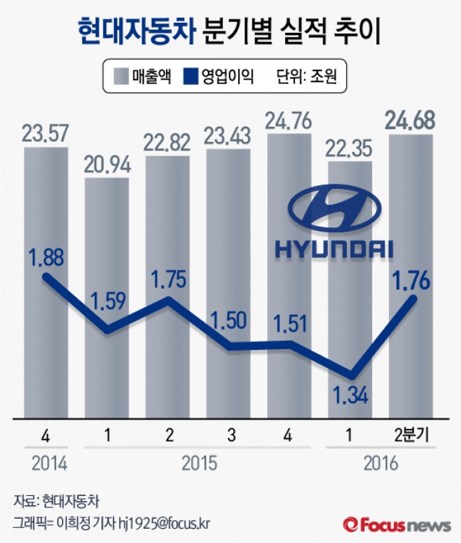 (서울=포커스뉴스) 26일 현대자동차는 올해 2분기 매출액 24조6767억원, 영업이익 1조7618억원을 기록했다고 공시했다.