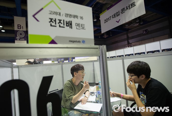 (서울=포커스뉴스) 26일 오후 서울 삼성동 코엑스에서 제1회 메가스터디 대입합격 박람회가 열리고 있다. 박람회장에서 한 학생이 '명문대 선배 즉문즉답' 부스에 앉아 상담 받고 있다.