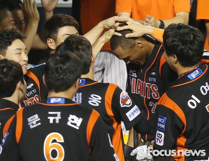 (서울=포커스뉴스) 26일 서울 잠실구장에서 열린 2016 프로야구 롯데-LG 경기 5회초 1사후 롯데 맥스웰이 좌월 솔로 홈런을 치고 더그아웃에서 동료들의 첫 홈런 축하를 받고 있다.