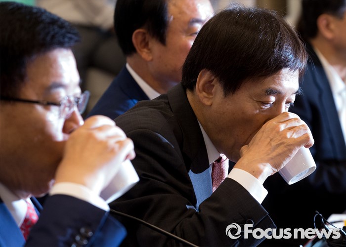 (서울=포커스뉴스) 27일 오전 서울 여의도 국회 귀빈식당에서 열린 경재재정연구포럼 조찬 간담회에 참석한 이주열(오른쪽) 한국은행 총재와 김광림 새누리당 정책위의장이 물을 마시고 있다.
