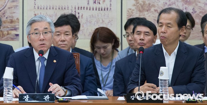 (서울=포커스뉴스) 27일 오전 서울 여의도 국회에서 열린 평창동계올림픽 및 국제경기대회지원 특별위원회 전체회의에 참석한 김종덕 문화체육관광부 장관이 의원들의 질의에 답하고 있다. 오른쪽은 최문순 강원도지사.