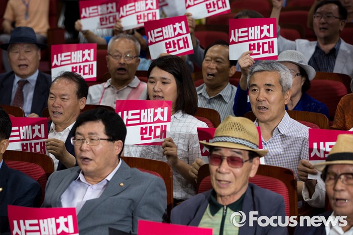 (서울=포커스뉴스) 함세웅(오른쪽 세 번째) 신부를 비롯한 정당인 및 시민단체 관계자들이 27일 오전 서울 여의도 국회의원회관에서 열린 '7.27 사드반대 사회원로-각계 인사 기자회견'에 참석해 사드배치 반대를 촉구하는 구호를 외치고 있다.