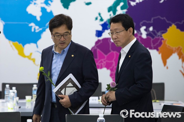 (서울=포커스뉴스) 국회 가습기 살균제 국정조사 특위 우원식 위원장(왼쪽)과 김상훈 위원이 27일 오전 서울 영등포구 여의도 옥시레킷벤키저 본사에서 열린 현장조사에 참석하고 있다. 가습기 특위는 옥시와 SK 케미칼, 애경, 이마트를 방문해 가습기 살균제의 제조 및 유통 판매 과정에서의 과실을 조사한다고 밝혔다.