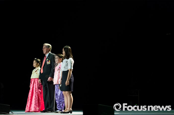 (서울=포커스뉴스) 27일 오전 서울 송파구 올림픽공원 올림픽홀에서 열린 정전협정 63주년 및 유엔군 참전의 날 기념식에서 6·25 전쟁 유엔군 참전용사와 학생들이 기념공연을 하고 있다.