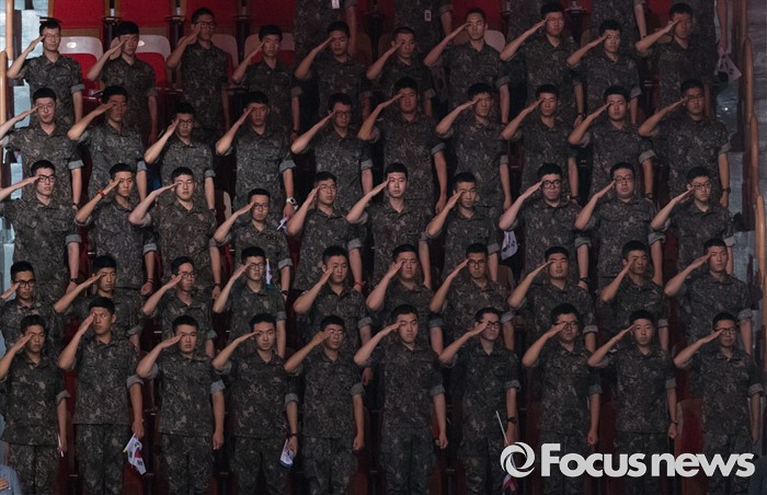 (서울=포커스뉴스) 27일 오전 서울 송파구 올림픽공원 올림픽홀에서 열린 정전협정 63주년 및 유엔군 참전의 날 기념식에서 장병들이 국기에 대한 경례를 하고 있다.