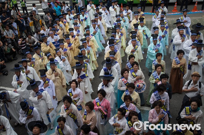(서울=포커스뉴스) 27일 오전 서울 종로구 청운효자동 주민자치센터 앞에서 열린 '사드 배치 반대 기자회견'에 참석한 성주 유림단체 회원들이 국민의례를 하고 있다.
