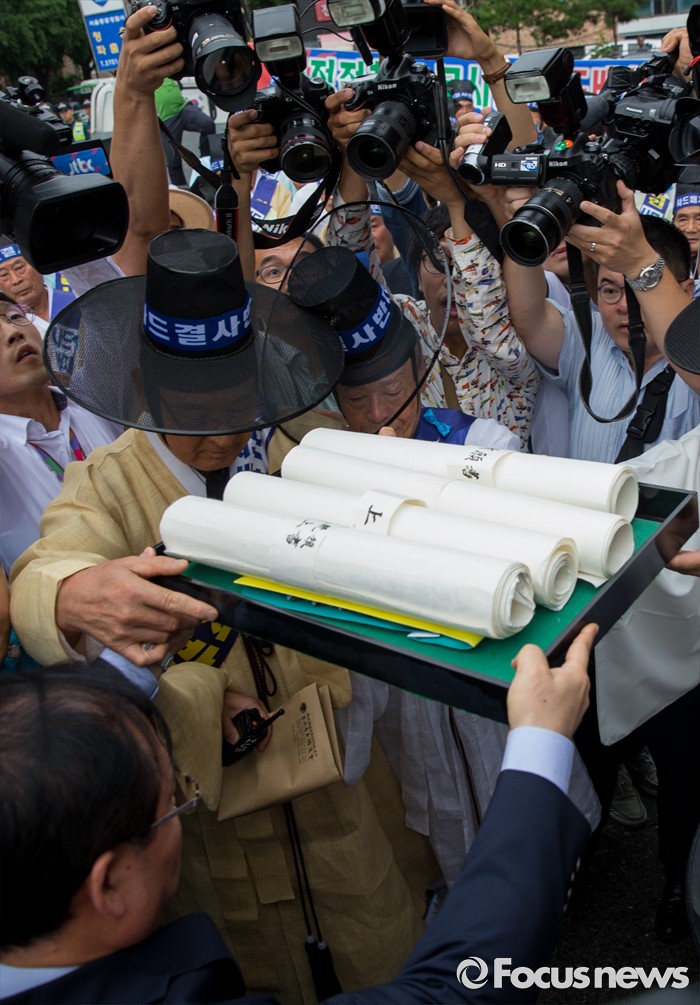 (서울=포커스뉴스) 27일 오전 서울 종로구 청운효자동 주민자치센터 앞에서 열린 '사드 배치 반대 기자회견'에 참석한 청와대 국민소통비서관이 성주 유림단체 회원들로부터 상소문을 전달받고 있다.
