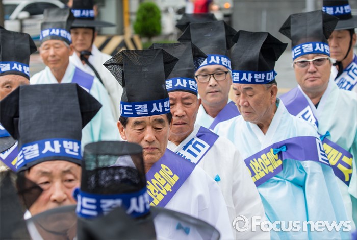 (서울=포커스뉴스) 27일 오전 서울 종로구 청운효자동 주민자치센터 앞에서 성주 유림단체 회원들이 '사드 배치 반대 기자회견'에 참석하기 위해 발걸음을 옮기고 있다.