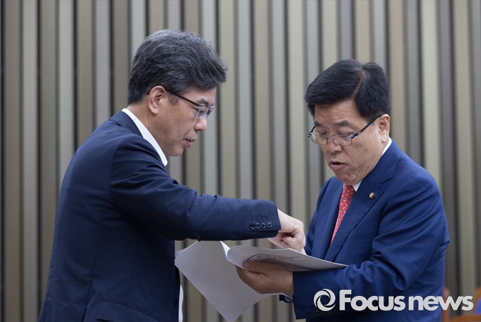 (서울=포커스뉴스) 27일 오전 서울 여의도 국회에서 열린 새누리당 의원총회에 참석한 김광림(오른쪽) 정책위의장과 송언석 기획재정부 2차관이 대화하고 있다.