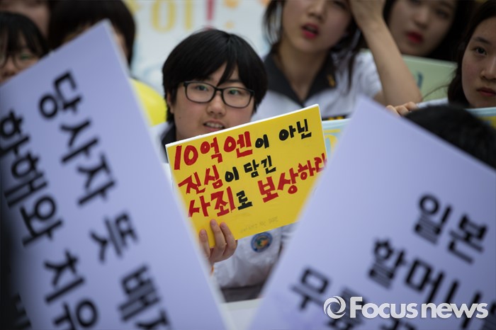 (서울=포커스뉴스) 27일 오후 서울 종로구 옛 일본대사관 앞에서 제1241차 일본군 위안부 문제해결을 위한 정기 수요집회가 열리고 있다.