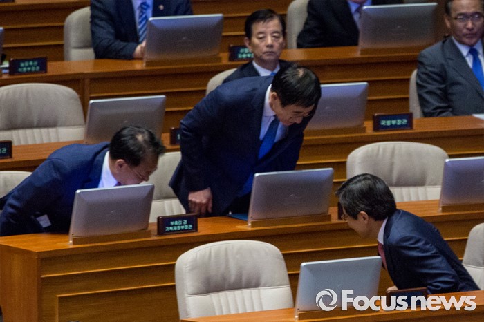 (서울=포커스뉴스) 황교안(오른쪽) 국무총리와 유일호(왼쪽) 경제부총리 겸 기획재정부장관, 이준식 사회부총리 겸 교육부 장관이 27일 오후 서울 여의도 국회에서 열린 344회 국회(임시회) 3차 본회의에 참석해 인사 하고 있다.