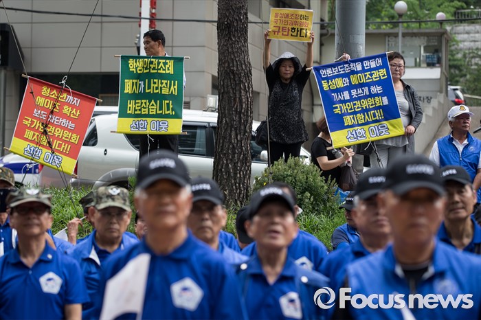 (서울=포커스뉴스) 27일 오전 서울 중구 국가인권위 앞에서 고엽제 전우회를 비롯한 보수단체가 국가인권위가 군 동성애를 조장하고 북한 인권에 무관심하다며 시위하고 있다.