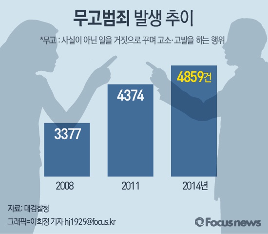 (서울=포커스뉴스) 27일 대검찰청 범죄분석에 따르면 2008년 3377건이었던 무고 범죄는 2011년 4374건, 2014년 4859건으로 약 6년 사이 1500여건이나 증가했다.