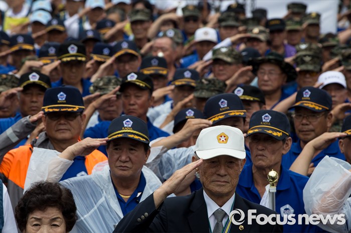 (서울=포커스뉴스) 27일 오후 서울 용산구 서울역광장에서 열린 사드배치 지지 범국민대회 및 자유민주평화통일 결의대회에 중앙보훈단체안보협의회·대한민국상이군경회 회원들이 국민의례를 하고 있다.