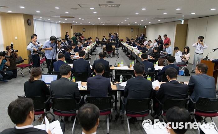 (분당=포커스뉴스) 27일 오후 경기도 성남 분당구 SK케미칼 본사에서 열린 가습기살균제 사고 진상규명과 피해구제 및 재발방지 대책마련을 위한 국정조사특별위원회 현장조사에서 김철 SK케미칼 대표이사가 업무보고를 하고 있다.