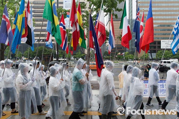 (서울=포커스뉴스) 27일 오후 서울 종로구 세종문화회관 인근에서 월드피스자유연합 관계자들이 6.25전쟁 당시 대한민국 지원 세계 67개국 국기를 들고 퍼레이드를 하고 있다.