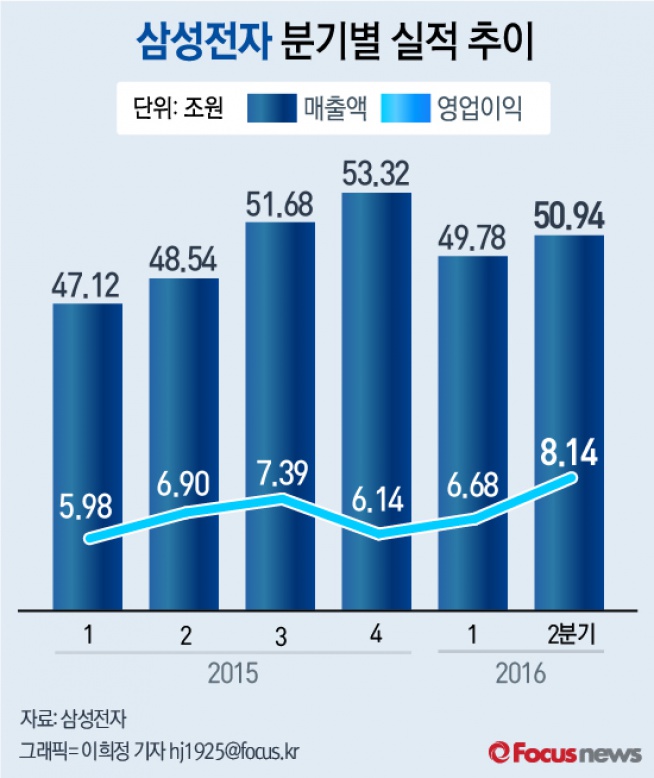 (서울=포커스뉴스) 28일 삼성전자는 올해 2분기 실적이 매출액 50조9400억원, 영업이익 8조1400억원이라고 공시했다. 삼성전자의 2016년 2분기 영업이익은 2014년 1분기 이후 9분기만에 8조원대로 올라섰다.