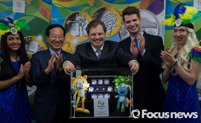 (서울=포커스뉴스) 28일 오전 서울 종로구 주한 브라질대사관에서 루이스 페르난도 세하(가운데) 주한 브라질 대사가 '2016 리우 올림픽 기념주화'를 공개하고 있다.