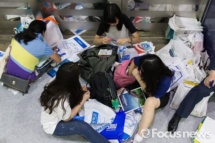 (서울=포커스뉴스) 28일 오전 서울 강남구 코엑스에서 열린 2017학년도 수시 대학입학정보박람회 행사장을 찾은 학생들이 바닥에 앉아 대학교 홍보책자를 보고 있다. 이번 박람회는 7월 28일부터 31일까지 나흘간 진행되며 전국 140개 4년제 대학이 참가한다.
