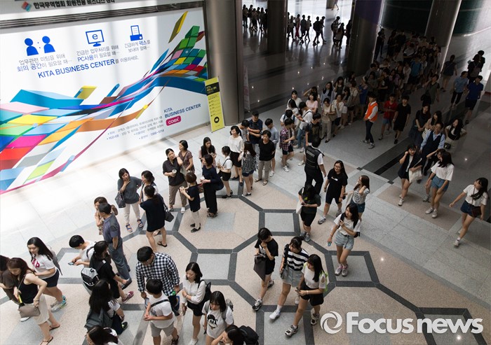 (서울=포커스뉴스) 28일 오전 서울 강남구 코엑스에서 열린 2017학년도 수시 대학입학정보박람회 행사장을 찾은 학부모와 학생들이 입장을 기다리고 있다. 이번 박람회는 7월 28일부터 31일까지 나흘간 진행되며 전국 140개 4년제 대학이 참가한다.